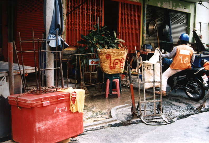 Eine von niemandem zu beantwortende Frage Satz auf der Kühltruhe, dem Absperrgitter, dem Korb, der Sackkarre und der Sicherheitsweste Bangkok 2005