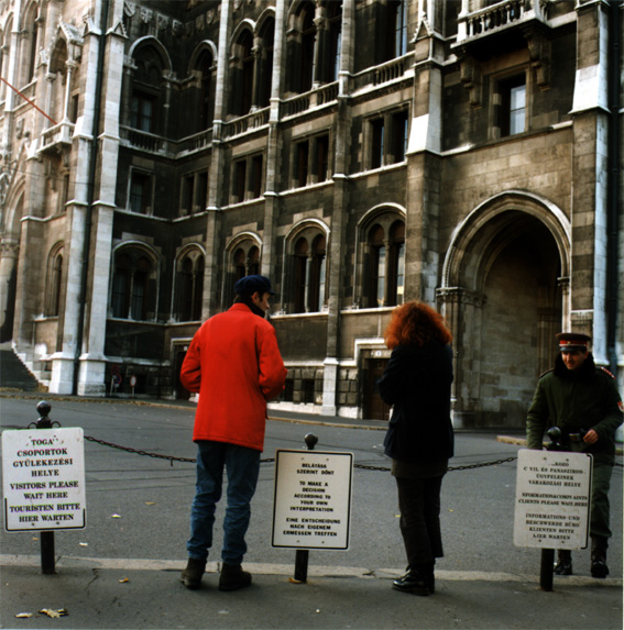 Vor dem Parlamentgebäude in Budapest. Wir ergänzen das mittlere Schild und schreiben: Eine Entscheidung nach eigenem Ermessen treffen Budapest 1998